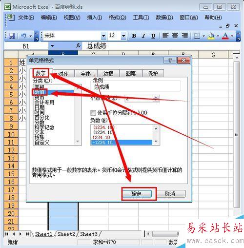 3、在單元格格式設置窗口中,依次點擊“數字”--“數值”,然后設置好小數位數,點擊“確定” 如圖
