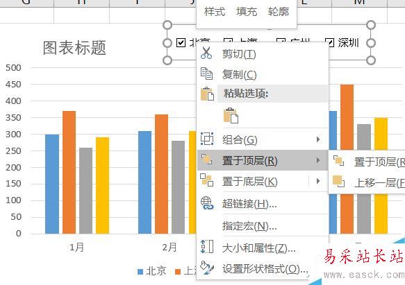 將剛才做好的4個復選框分別移動到制作好的圖表之上,這里有個小技巧,可以先將4個復選框組合起來移動,然后右鍵單擊選擇“置于頂層”,之后再取消組合,方便后面單獨設置每個復選框。