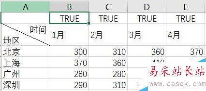 重點來了,復制剛才生成表格的數據,然后在復制的表格中找到對應的數據輸入公式,比如在例子中B10單元格,針對北京的1月份數據框填入“=IF($B$1=TRUE,B3,0)”(這是鎖定前半部分的公式,你可以根據自己的需求使用F4切換鎖定方式)。這就是剛才我們設置的B1復選框選中的單元格,勾選時顯示北京的數據情況,反之則不顯示為0。而鎖定前半部分公式的目的是在于橫向2月~4月單元格復制公式時,前半部分公式判定不會隨動。