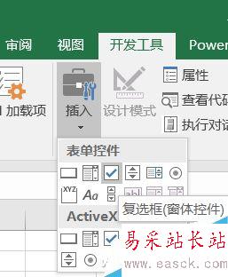 切換到開發工具選項卡中,單擊插入下拉箭頭,選擇“復選框”