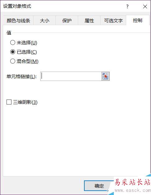 修改完畢后,繼續右鍵單擊選擇設置控件格式,切換到“控制”選項卡,將值選為“已選擇”,并在“單元格鏈接”中選中一個空白單元格,小編推薦在Excel第一行列中選取。比如像我們要制作的動態圖表一共有北京、上海、廣州、深圳四組數據項,那就分別將四個復選框的單元格鏈接都要做上,這里分列為B1、C1、D1、E1。