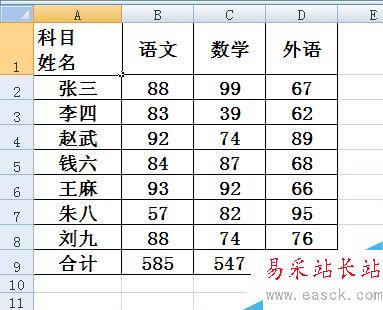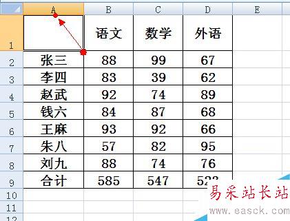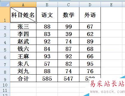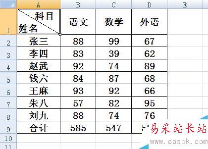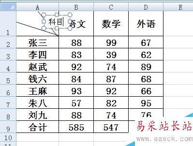 5、此時A1單元格斜線設置完成,那么下一步就是輸入表頭文字,因為科目是在上方,姓名是在下方,此處我們輸入的順序是“科目姓名”。