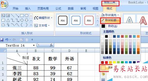 7、看到該文本框默認有邊框顯示,可點擊繪圖工具,選擇形狀輪廓,點擊無輪廓。通過這個操作去除文本框的邊框。