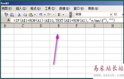 6.選中A2到A9單元格,然后,在編輯欄中輸入公式:=IF(A$1+ROW(A1)<A$10,TEXT(A$1+ROW(A1),"e/mm/d"),"")