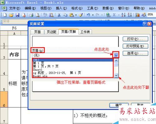 3、點擊“頁眉”項后面的向下的箭頭,彈出下拉菜單,可以查看到頁眉的所有格式,選擇合適的單擊,然后點擊確定。比如我們選擇“第1頁,共?頁”格式,然后確定。