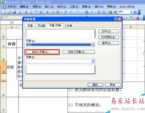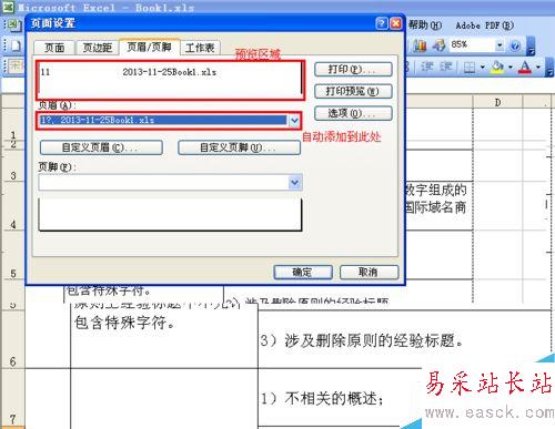 3、我們可以在頁面設置對話框中看到預覽情況,并且設置自動添加到“頁眉”下拉菜單中,以便下次使用同樣設置,直接打開選中即可。