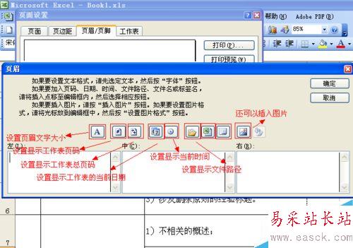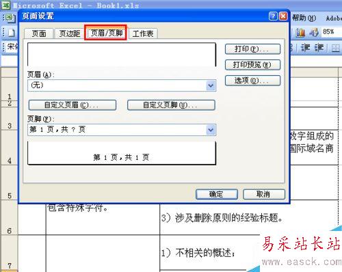 4、設置“頁腳”的方法同設置“頁眉”的方法相同,在第1步中選擇“自定義頁腳”按鈕,然后其他步驟可以參照設置頁眉的方法。