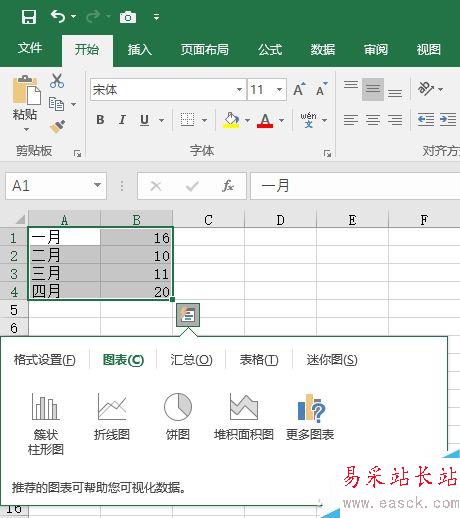確定好類型后,在Excel中將數(shù)據(jù)轉(zhuǎn)換成圖形非常簡單,選中相關(guān)的數(shù)據(jù)后,即可在“插入”選項(xiàng)卡中選擇圖表類型了。也可以點(diǎn)擊數(shù)據(jù)右下角“快速分析”按鈕,在彈出框中切換到“圖表”項(xiàng),快速選擇生成相應(yīng)的圖表。