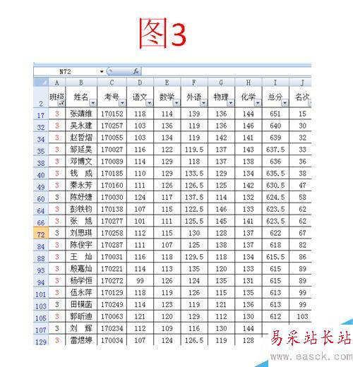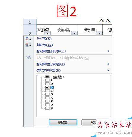 點擊“班級”單元格內右下方的小圖標,會彈出第五步的圖片。我們篩選的是3班的成績。那么先勾畫掉“全部”(指所有9個班的學生成績)選項(如下圖1)。然后再勾畫“3”,系統自動會默認勾畫“全部”。(這里的全部是指3班的全部,即所有三班學生的成績,如下圖2),點擊“確定”,這樣,即將3班學生的成績篩選出來了。(如下圖3)