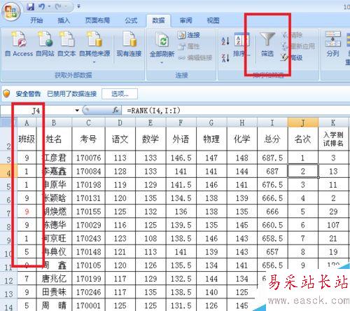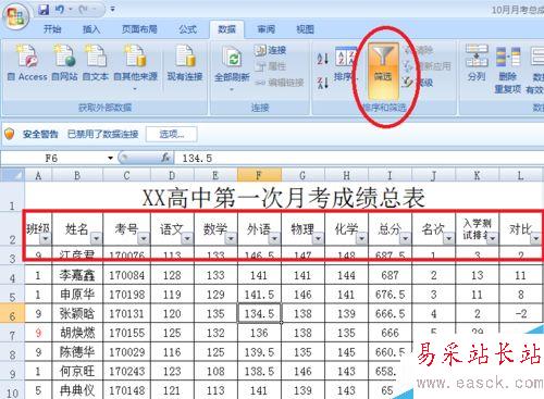 第七步:其他目標數據篩選方法同“班級”篩選。如果需要把篩選的成績返回到最初的樣式(即所有9個班的成績),再次點擊“數據”下方“篩選”選項即可。(如下圖)