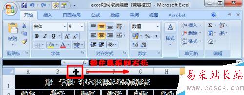1、將鼠標放在列標簽被隱藏列的中間,當鼠標變成如圖可拖動的雙箭頭時按住向右拖動。