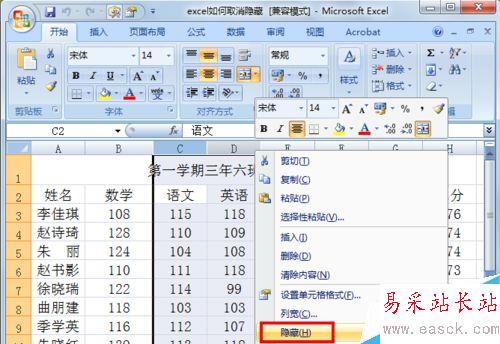 2、然后右鍵單擊被選中的單元格,選擇隱藏。