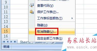 3、在下面其中一個工作表上右擊,選擇取消隱藏。