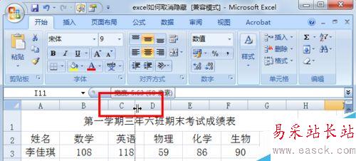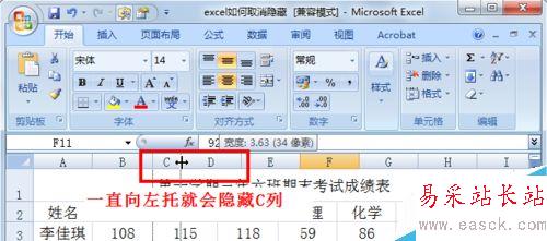 2、托的過程中就會看見D列顯示出來了,用同樣方法把C列也托出來。