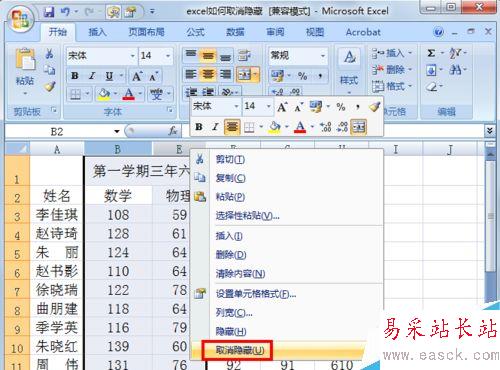 2、在被選中的單元格中右鍵單擊,選擇取消隱藏。
