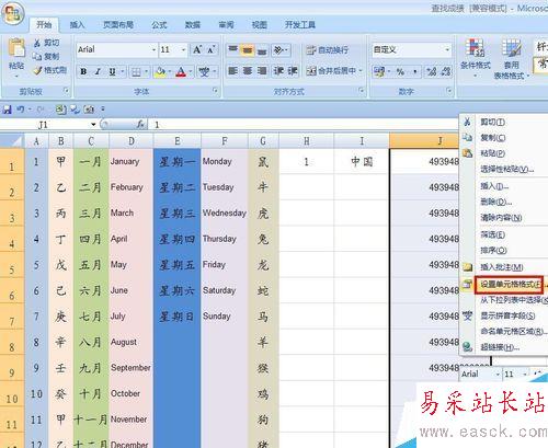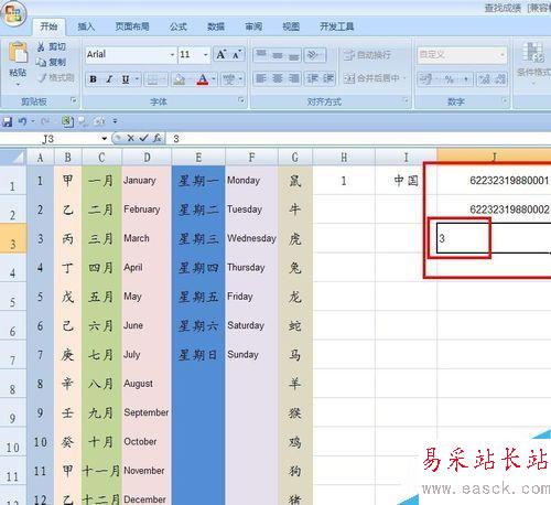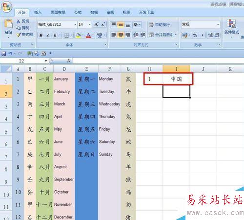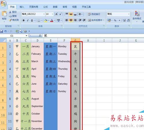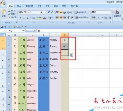 這時候我們在原來的工作表中試試,在G1、G2中分別輸入鼠、牛,向下拉填充手柄,看看效果,是不是得到我們要的效果了。