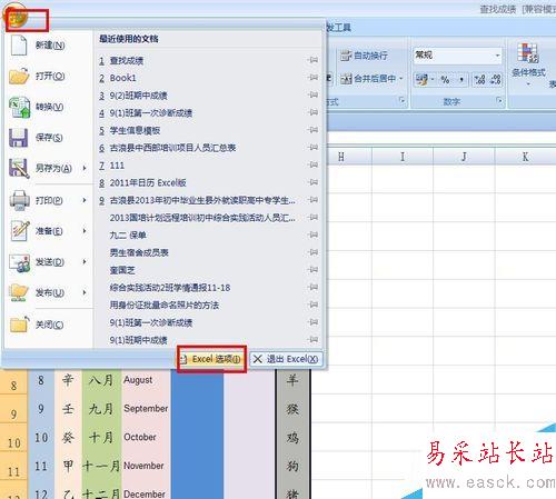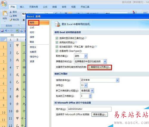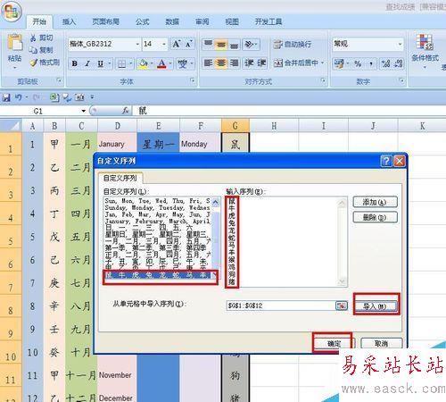 還有一些我們常用的序號,在EXCEL中沒有辦法直接輸入,我們可以通過自定義來實現,在G列中輸入鼠、牛……,選定單元格,單擊OFFICE——EXCEL選項——常用——編輯自定義列表,單擊彈出對話框,點擊導入,可以看到我們導入的序列,點擊確定。