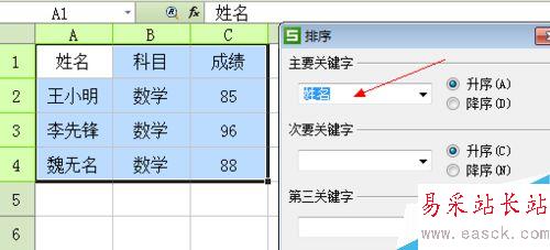 5、在步驟4可知,排序不僅針對(duì)數(shù)字,對(duì)于中文漢字也可以排序。中文漢字的默認(rèn)排序一般是拼音排序,還有一種是筆畫排序。這里以拼音排序?yàn)槔?/p>