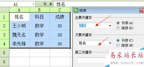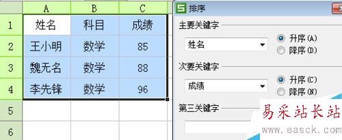 4、彈出的排序?qū)υ捒?,首先選擇以成績(jī)第一關(guān)鍵詞,升序;其次選擇名字為第二關(guān)鍵詞,同樣為升序。編輯完排序?qū)υ捒蚝蟠_定,可以看到表格排序結(jié)果。