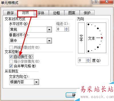 7、在單元格格式對話框中,點擊對齊,來到對其面板。勾選自動換行,然后點擊確定。自動換行功能使得文字在超出表格的時候自動切換到下一行,這樣這段文字就不會超出表格了。