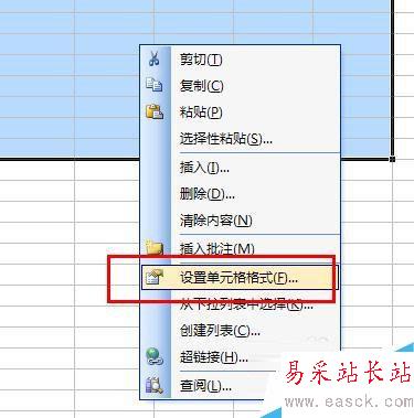 2、右鍵單擊這個區域,彈出右鍵菜單,在右鍵菜單中,我們選擇設置單元格格式。