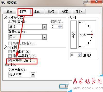 3、在單元格格式中,我們點擊對齊,在對齊面板中,我們勾選合并單元格,然后點擊確定,就完成了合并。