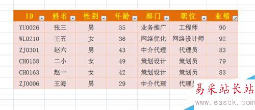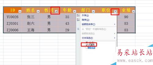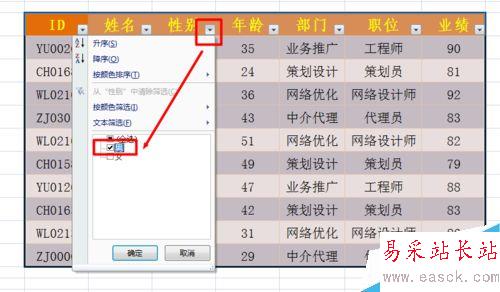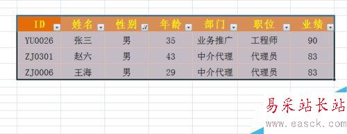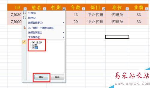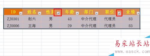 3、同時還支持多重條件篩選,只需要分別設置各個標題的篩選項即可。比如我們篩選“男性”、“代理員”時的篩選結果如圖: