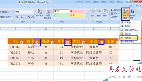 9、當我們需要對區域中的所有篩選項進入消除時,可以通過點擊“排序和篩選”->“消除”項來實現所有篩選項的消除操作。