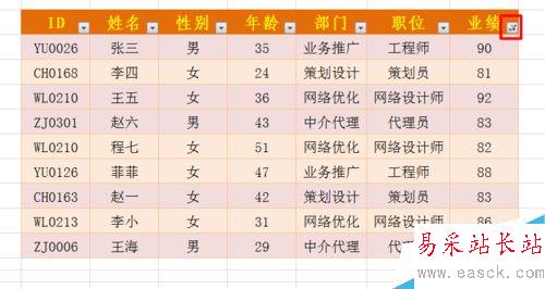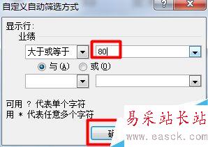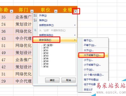 4、另外針對數字,還提供了條件篩選功能。例如當我們需要選擇“業績大于80”的員工信息時,只需要點擊“業績”標題處的下拉箭頭,從彈出的擴展菜單中選擇“數字篩選”->“大于或等于”項。