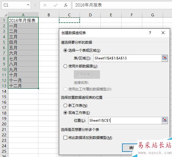 在打開的創(chuàng)建數(shù)據(jù)透視表對(duì)話框中,“選擇一個(gè)表或區(qū)域”項(xiàng)已經(jīng)自動(dòng)填入了參數(shù),就是上面所選擇的數(shù)據(jù)區(qū)域。如果開始并沒有做選擇,那么在此可以重新選擇。在下面選中“現(xiàn)有工作表”項(xiàng),并將光標(biāo)置入“位置”右側(cè)的輸入框中,再在工作表任意空白單元格上點(diǎn)擊,選擇放置透視表的地方。這里小編選擇的是C1單元格。