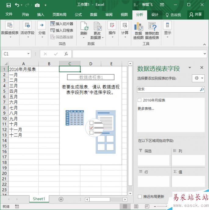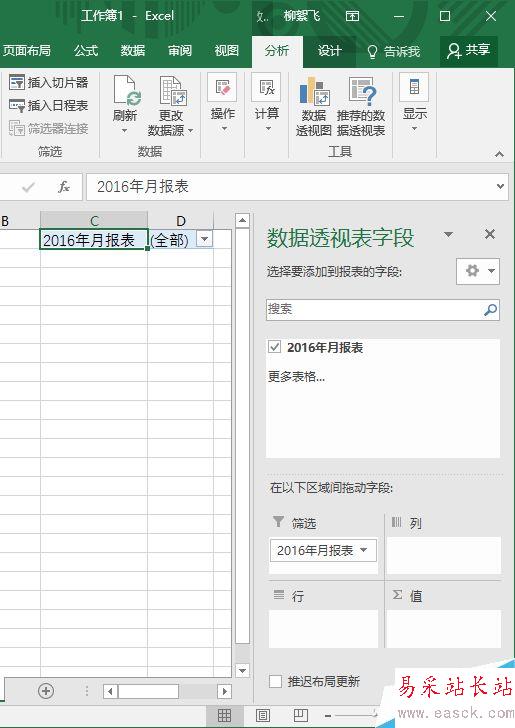 在透視表窗格中,將“2016年月報(bào)表”(這個(gè)名稱根據(jù)你之前所設(shè)置的列表標(biāo)題而定)拖放到下面的“篩選”框中。