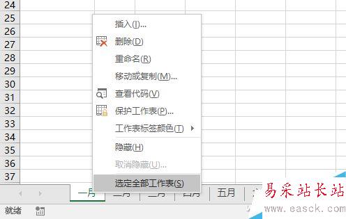 接下來的問題是,所有創(chuàng)建的工作表中,都會(huì)有一個(gè)透視表,而現(xiàn)在我們已經(jīng)不需要它了。在任意一個(gè)工作表標(biāo)簽上右擊,從右鍵菜單中選擇“選定全部工作表”。