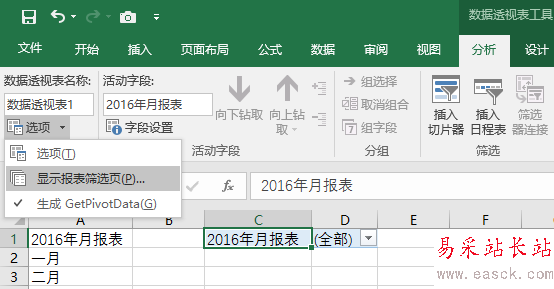 接下來選中C1單元格(即存放數(shù)據(jù)透視表的單元格),然后切換到“數(shù)據(jù)透視表工具-分析”選項(xiàng)卡,點(diǎn)擊工具欄左側(cè)“選項(xiàng)”邊的箭頭,從下拉菜單中選擇“顯示報(bào)表篩選頁”。