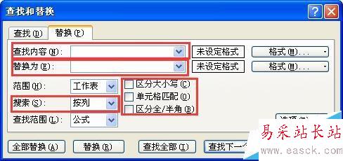 2、搜索框中選“按列”,區分大小寫、單元格匹配、區分全/半角的前面不要選擇,最后點擊全部替換,就能把整列替換成無空格了。用查找替換法需要知道要查找的內容,但因為是不可見空格或符號,所以只能替換空格,而無法替換其它不可見符號。