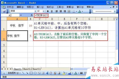 =trim(text),用來刪除字符串前后的空格,但是會在字符串中間保留一個作為連接用途。實例解說如圖