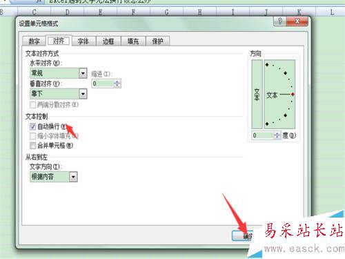 2、進(jìn)入單元格格式之后,在對(duì)齊菜單下,將自動(dòng)換行的按鍵選中,之后點(diǎn)擊確定。
