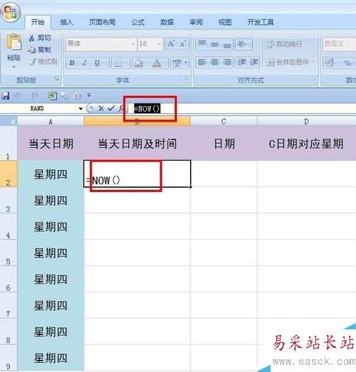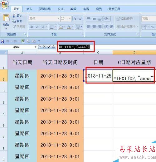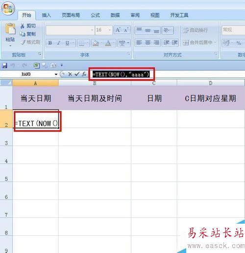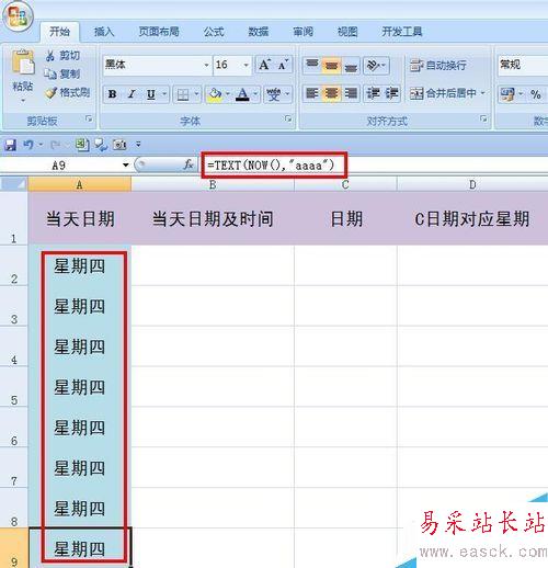 點擊A2單元格,在C2單元格中輸入=TEXT(NOW(),"aaaa"),回車,我們可以看到當天的日期出現了。依次用填充手柄從A2拖到A9,是不是全部填充了當天日期。