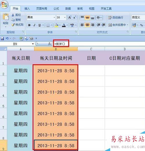 點擊B2單元格,在B2單元格中輸入=NOW(),回車,我們可以看到當天的日期時間都出現了。依次用填充手柄從B2拖到B9,是不是全部填充了當天日期時間。