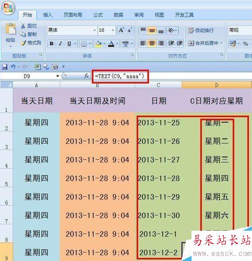 在C2:C9單元格中依次輸入日期,日期格式為“2013-11-25”,然后再D2單元格中輸入=TEXT(C2,"aaaa"),回車我們看到出現了一個星期,這個星期正好是C2單元格日期對應的星期。依次在C3到C9中輸入不同的時間,用填充手柄把D2拉倒D9,是不是出現了對應日期。