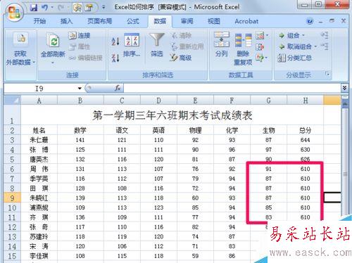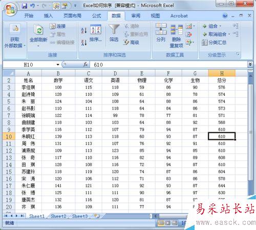 1、如果簡單的升序降序排序滿足不了你,想要為總分排序的同時也對生物成績同時排序,那么就要用到多關鍵字進行排序了。首先看一下這個表格,總成績是610的有很多。