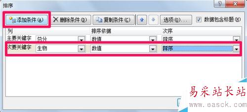 4、點擊添加條件后就會出現次要關鍵字,選擇相應關鍵字和排序方式,然后點擊確定。(這里可以添加多個次要關鍵字)
