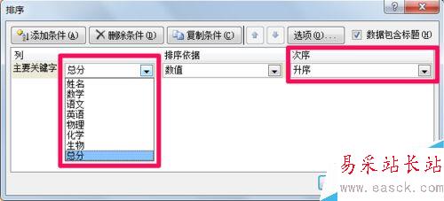 3、在排序對話框中可以選擇主要關鍵字以及次序方式等。