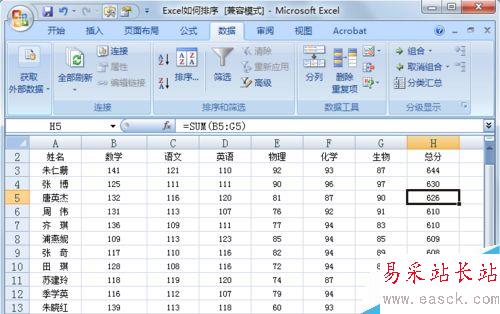 5、這時大家就可以發(fā)現,數據以總分降序排列的同時,又以化學成績進行降序排列。這就是Excel排序的方法,怎么樣又詳細又簡單吧。