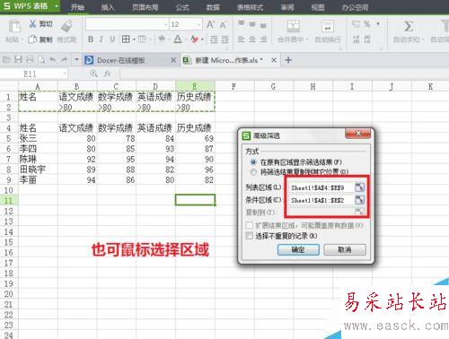 6、列表區(qū)域和條件區(qū)域:打開高級篩選后可輸入單元格范圍或使用鼠標勾選需要的區(qū)域,分別勾選列表區(qū)域和條件區(qū)域