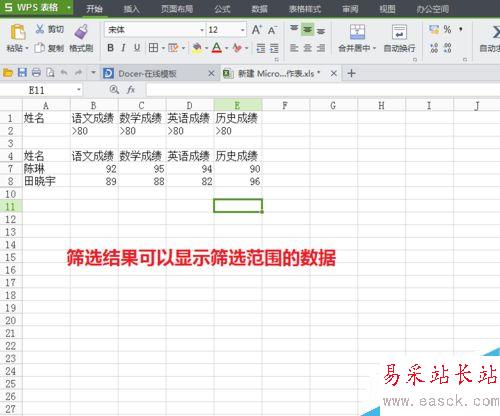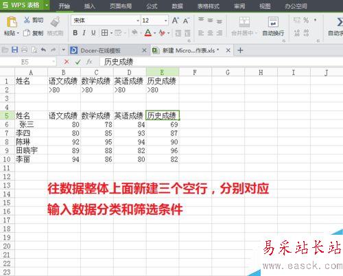 4、建立區(qū)域:如果要篩選出多個分類的成績如四門成績大于80分的同學,我們需要預先建立條件區(qū)域,將數據整體上方空出三行或以上,分別對應輸入數據分類和需要的條件限制