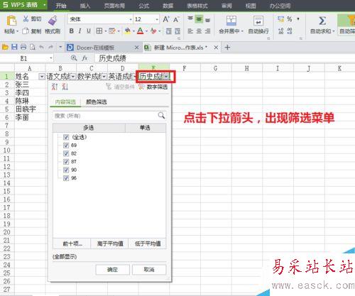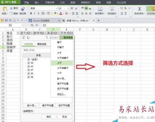 3、篩選方式:點擊數字篩選可以為含有大量數據的表格文件進行特定的數據篩選或某個數值區(qū)間的數據篩選。比如我們需要篩選出歷史成績小于85分的項目,點擊數字篩選,選擇小于,輸入85即可進行篩選