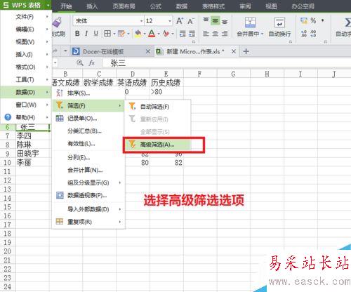 5、高級篩選:點擊菜單欄-數據-篩選-高級篩選,以此打開高級篩選的菜單