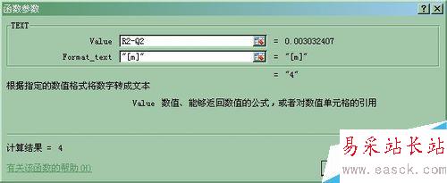6、公式輸入完成,點擊√。結果顯示4分鐘,公式分鐘是忽略秒的;那么按秒計算則沒有忽略,大家想顯示具體分鐘可以用秒計算,出來的結果再/60的到的數據就是準確的分鐘。