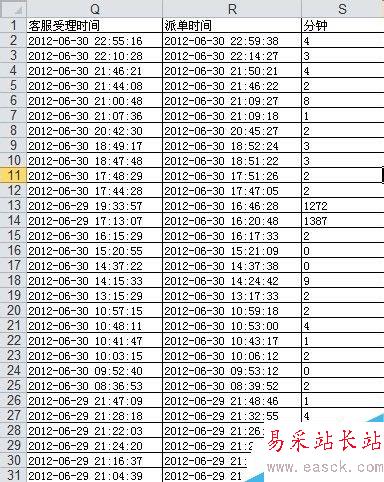 1、工作中,大家拿到這樣一張表格,需要計算它之間的間隔可能是秒可能是分鐘也可能是小時,數據量比較大,月報表一般都有幾萬條少者也有好幾千,那么我們如何快速的計算他的時間間隔數呢?小編較大家一個方法1分鐘之內解決!