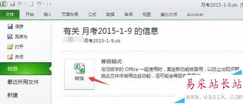 4、還可以點擊文件——信息,在這里有一項是兼容模式,點擊旁邊的轉換,也就可以了轉換成.xlsx格式的。